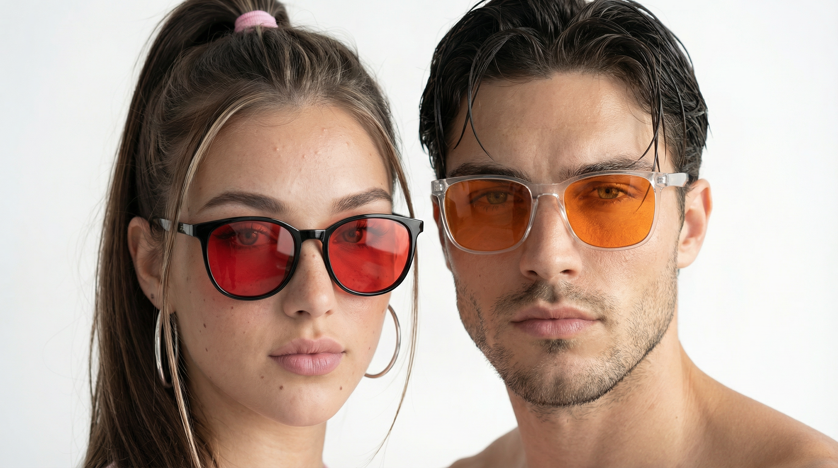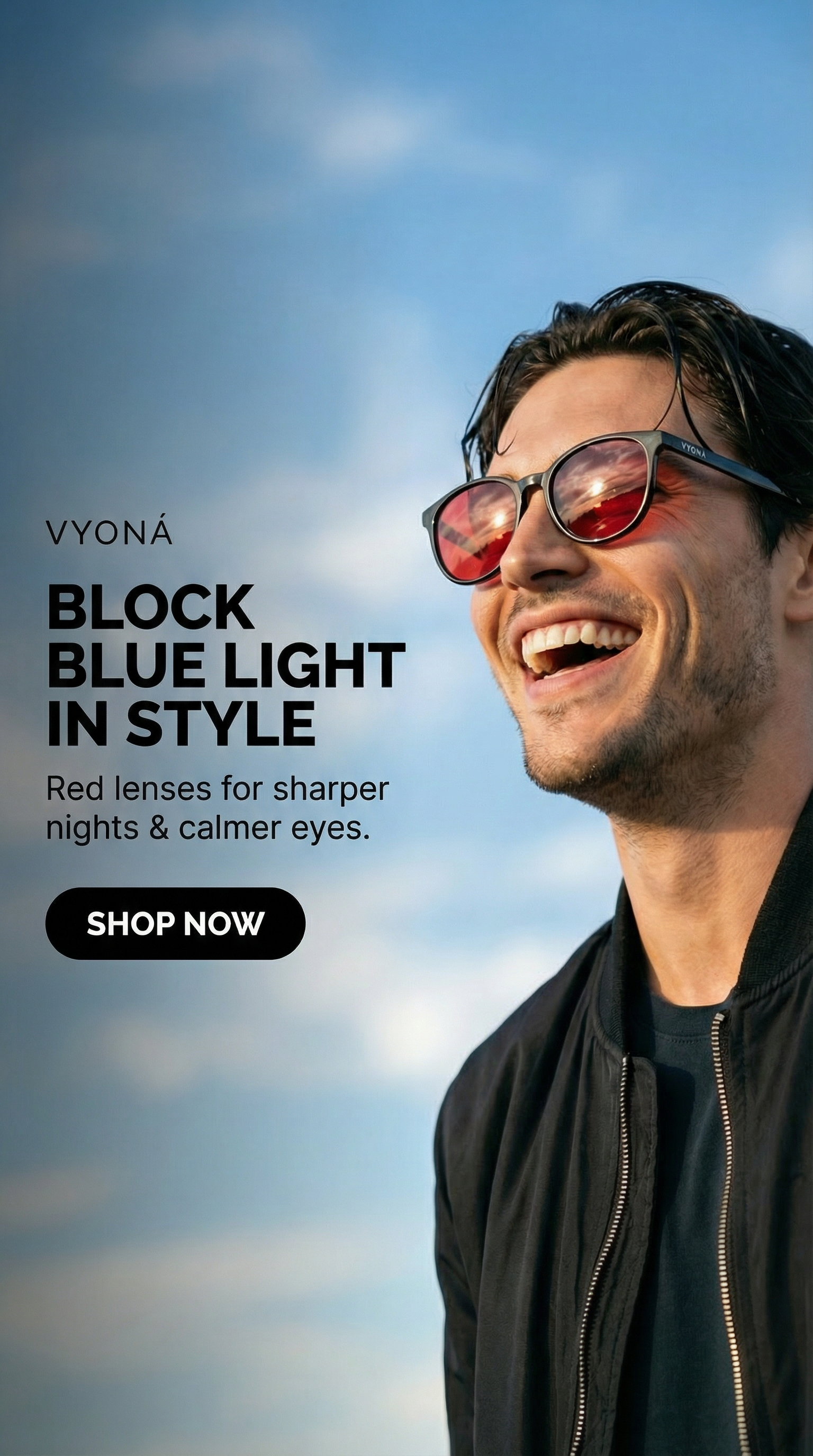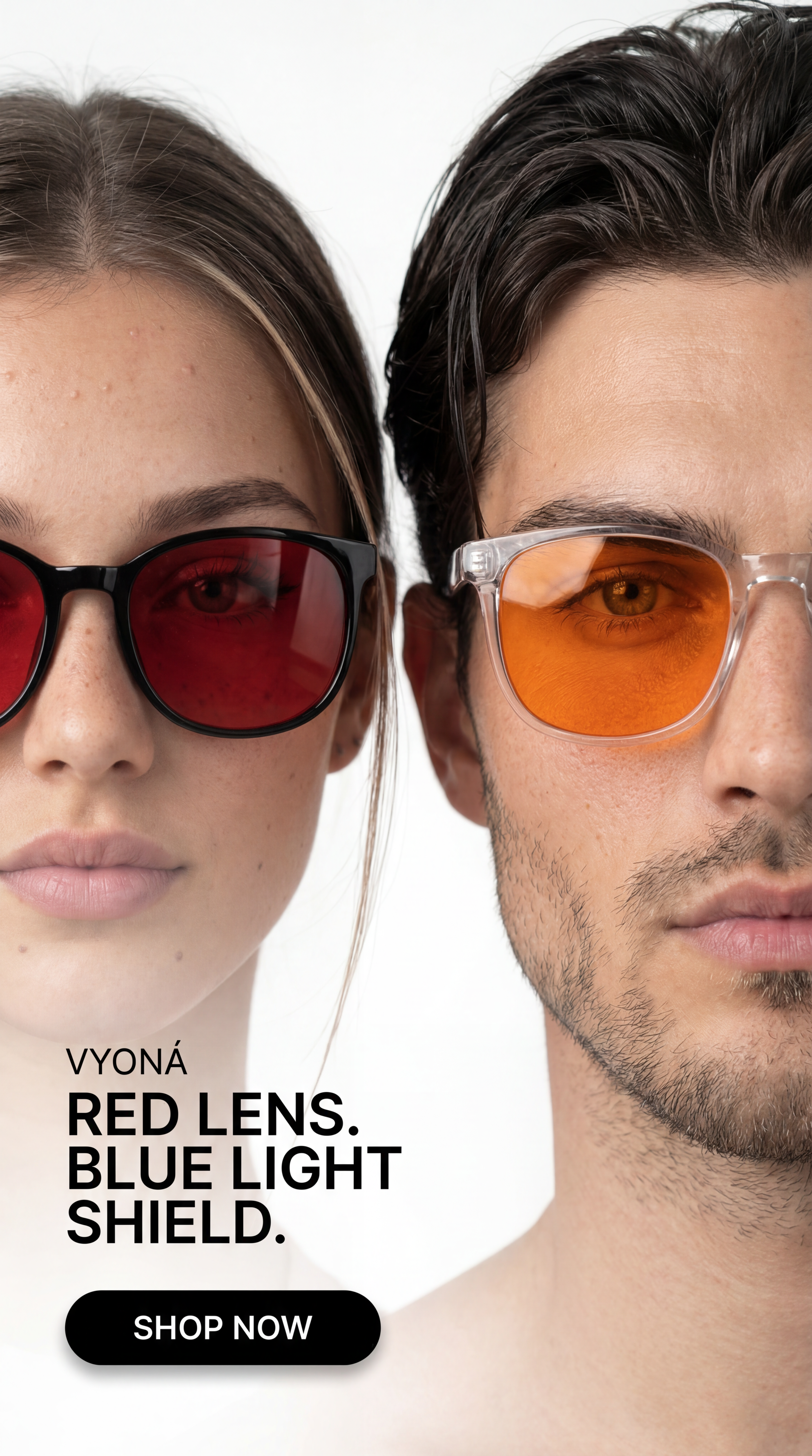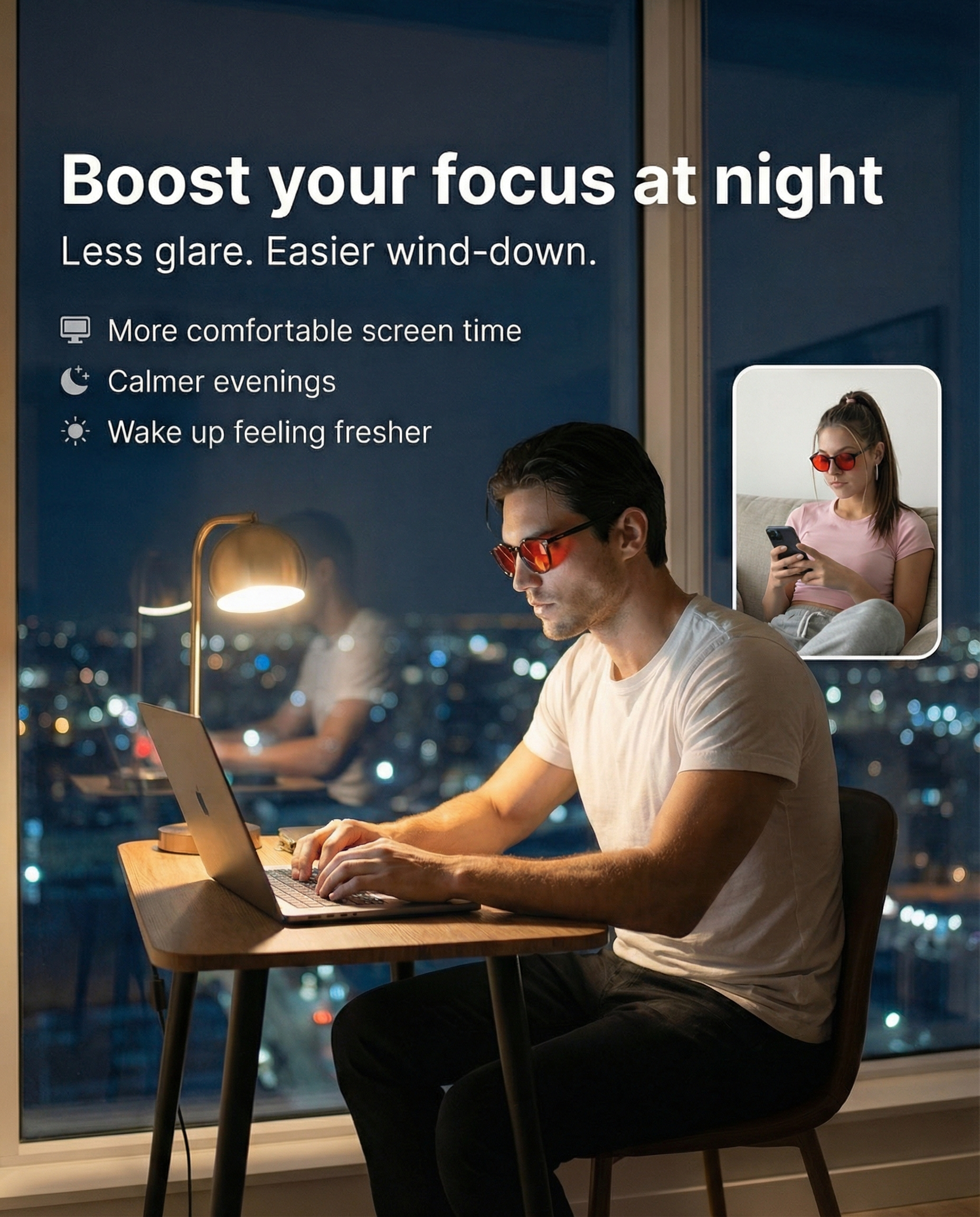 Night mode only dims your screen. Red lenses filter the blue/green wavelengths (400–520nm) that hit your eyes hardest at night — helping reduce eye strain and support a calmer wind-down.